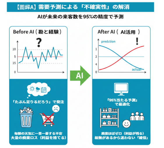 AIは、時間帯別の来客数や、どのメニューがどれだけ注文されるかを、なんと95%を超える精度で予測してみせたのです。