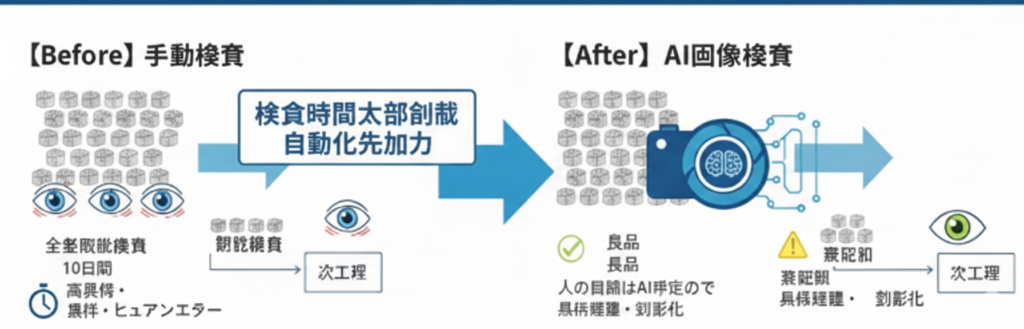 わずかな傷や変形も見逃せない、厳しい品質基準。検査員の方々は、どれだけ神経をすり減らし、心身ともに大きな負担を感じていたことでしょう。